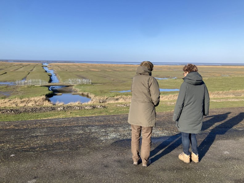 Het landschap hier is bijzonder. Ik verbaas me over de stilte, over het land dat langzaam overgaat in zee. We lopen een laatste stuk de polder in, voordat we weer terugkeren over de dijk. Ineke vertelt verder: “Het gebied was niet gastvrij; overal stonden bordjes ‘privé’.” Nog steeds worden bezoekers gewaarschuwd wanneer zij het land buiten de dijk willen betreden, omdat defensie er oefeningen houdt. De Waddenzee is inmiddels werelderfgoed, verdere aanwinning is niet toegestaan. Het land is nog steeds van de boeren, alleen de dijk is onteigend. ’s Zomers grazen er schapen, als wij er zijn, zien en horen we alleen land en vogels.